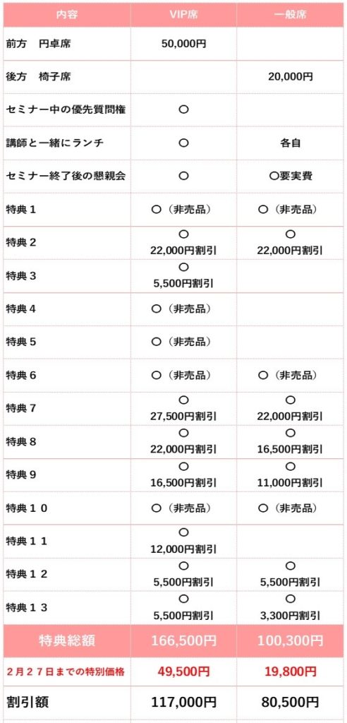 ◆参加費:2月27日までの前売り価格 ・VIP *セミナー前方テーブル席 ・一般席 *セミナー後方椅子席 |